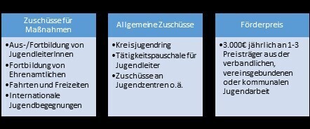 • Als weiteres besonderes Förderinstrument kommt der jährlich ausgelobte Förderpreis für gute Jugendarbeit hinzu, mit dem gelungene Projekte im Themensegment gewürdigt werden.